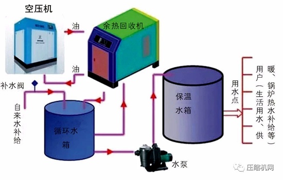 压缩机热能热水机组是将高温循环油(和高温压缩气体)引入热能热水机组内,空压机运行过程中所产生的热能被热能热水机充分吸收,同时压缩机得以降温。